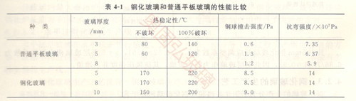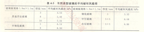 不同類型的玻璃抗風壓強度,可根據相同尺寸下普通玻璃的抗風壓強度乘以相應的調整系數來計算。以1800mm*1500mm玻璃板為試樣,表4-3給出了不同類型玻璃的平均破壞風載荷。