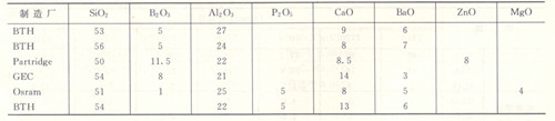 由于化學組成中的SiO2、PbO等會在鈉蒸氣作用下還原發黑,為此這組玻璃的化學組成選用鋁硼酸鹽,國外鈉燈玻璃的化學組成見表3。而鎘、鎘鎂、銫蒸氣燈則采用堿硼鋁硅酸鹽玻璃。