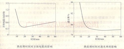 熱處理是將對方塊電阻的影響如圖6所示,由圖可以看出,熱處理時間較短時,ITO薄膜方塊電阻較大,隨著熱處理時間的增加,ITO薄膜方塊電阻迅速減小;當熱處理時間超過15min后,隨著熱處理時間的增加,ITO薄膜方阻緩慢上升。熱處理時間較短時,ITO薄膜晶粒較小,方塊電阻較大;隨著熱處理時間的增加,ITO薄膜晶粒變大,方塊電阻迅速下降;當熱處理時間超過15min后,隨著熱處理時間的增加,ITO薄膜晶粒變大,方塊電阻迅速下降;當熱處理時間超過15min后,隨著熱處理時間的增加,ITO薄膜晶粒尺寸變化不大,方塊電阻變化不大。